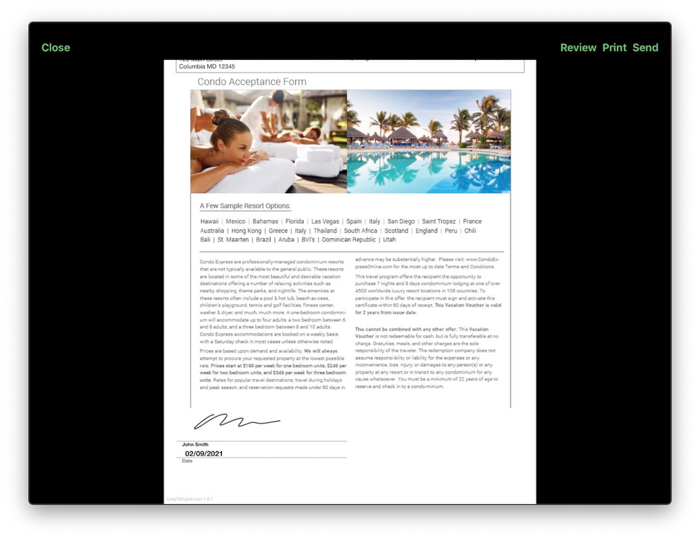 6. Hit Next. Then tap and click Send in the top right and the Acceptance Form will be sent toDestination Motivation. The homeowner will then be contacted by Destination Motivation within24-48 hours: